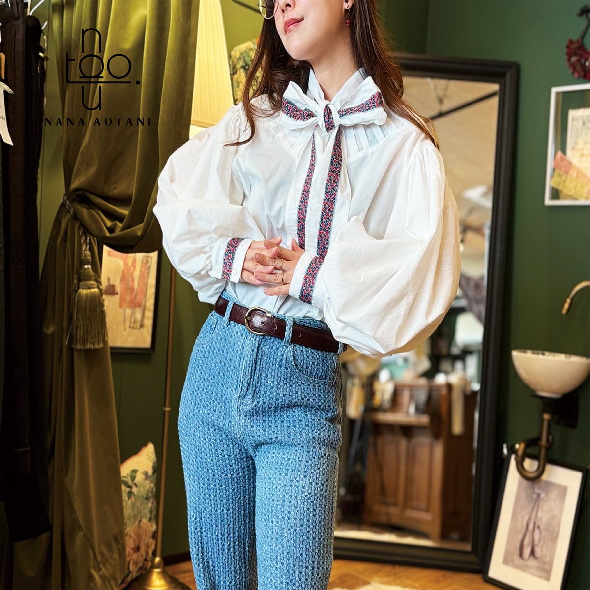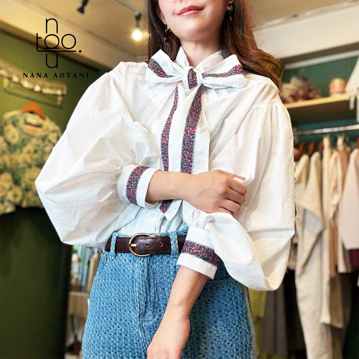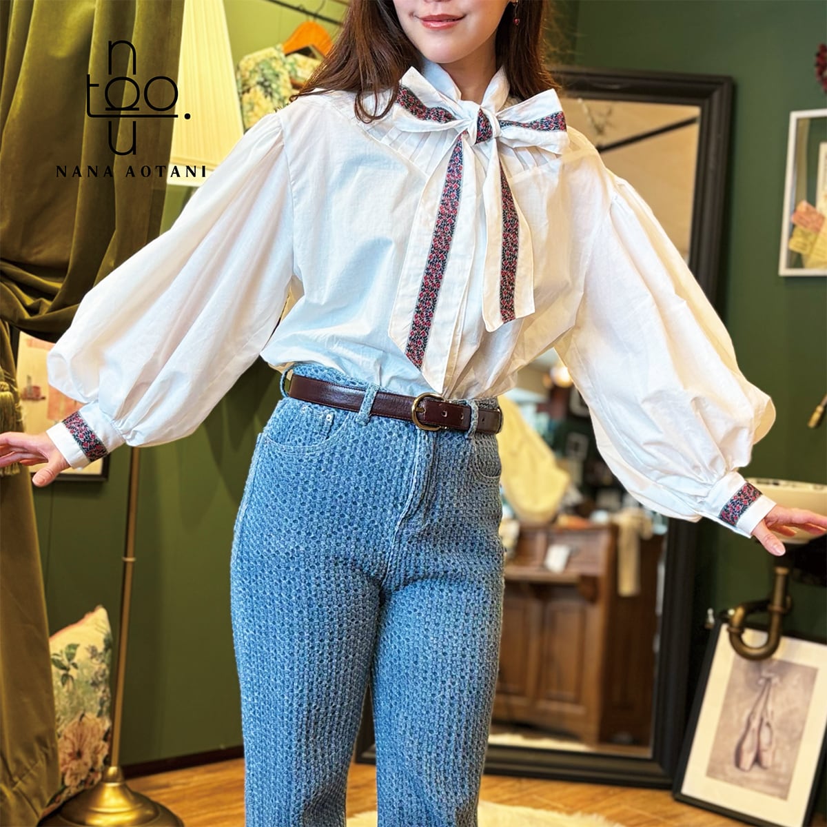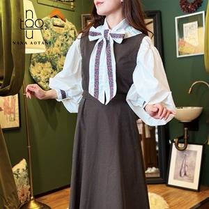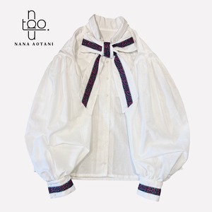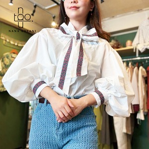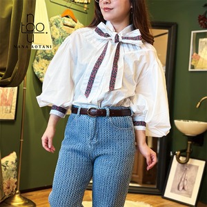 クラシカルなスタイルのビックシルエットのバルーン袖と、ネックリボンとカフスには同じチロリアンテープを施しました✨ 胸元にはタックでデザインを^^ ブラウス1枚でシンプルでも存在感のあるコーディネートに。 size バスト:112cm 着丈 :58cm 袖丈 :58cm カフス周り:22cm 綿100%