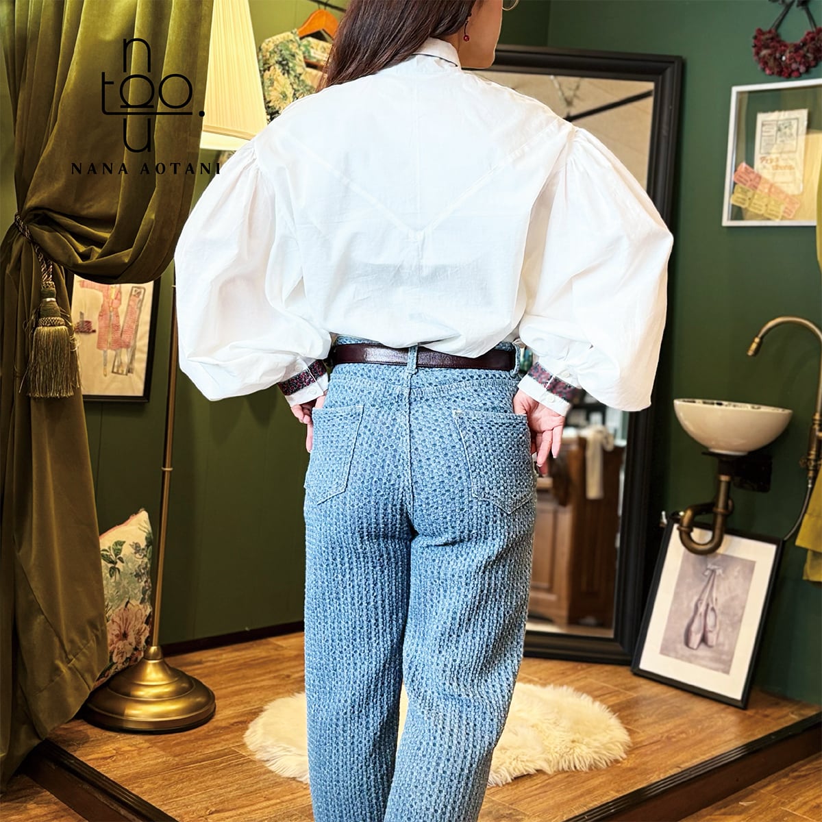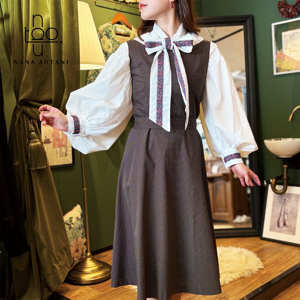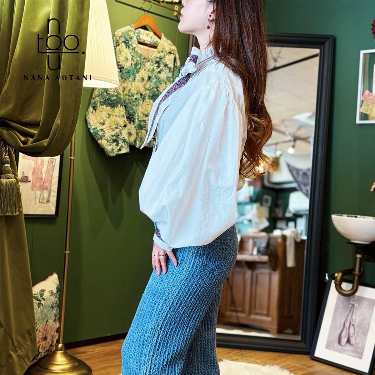 クラシカルなスタイルのビックシルエットのバルーン袖と、ネックリボンとカフスには同じチロリアンテープを施しました✨ 胸元にはタックでデザインを^^ ブラウス1枚でシンプルでも存在感のあるコーディネートに。 size バスト:112cm 着丈 :58cm 袖丈 :58cm カフス周り:22cm 綿100%