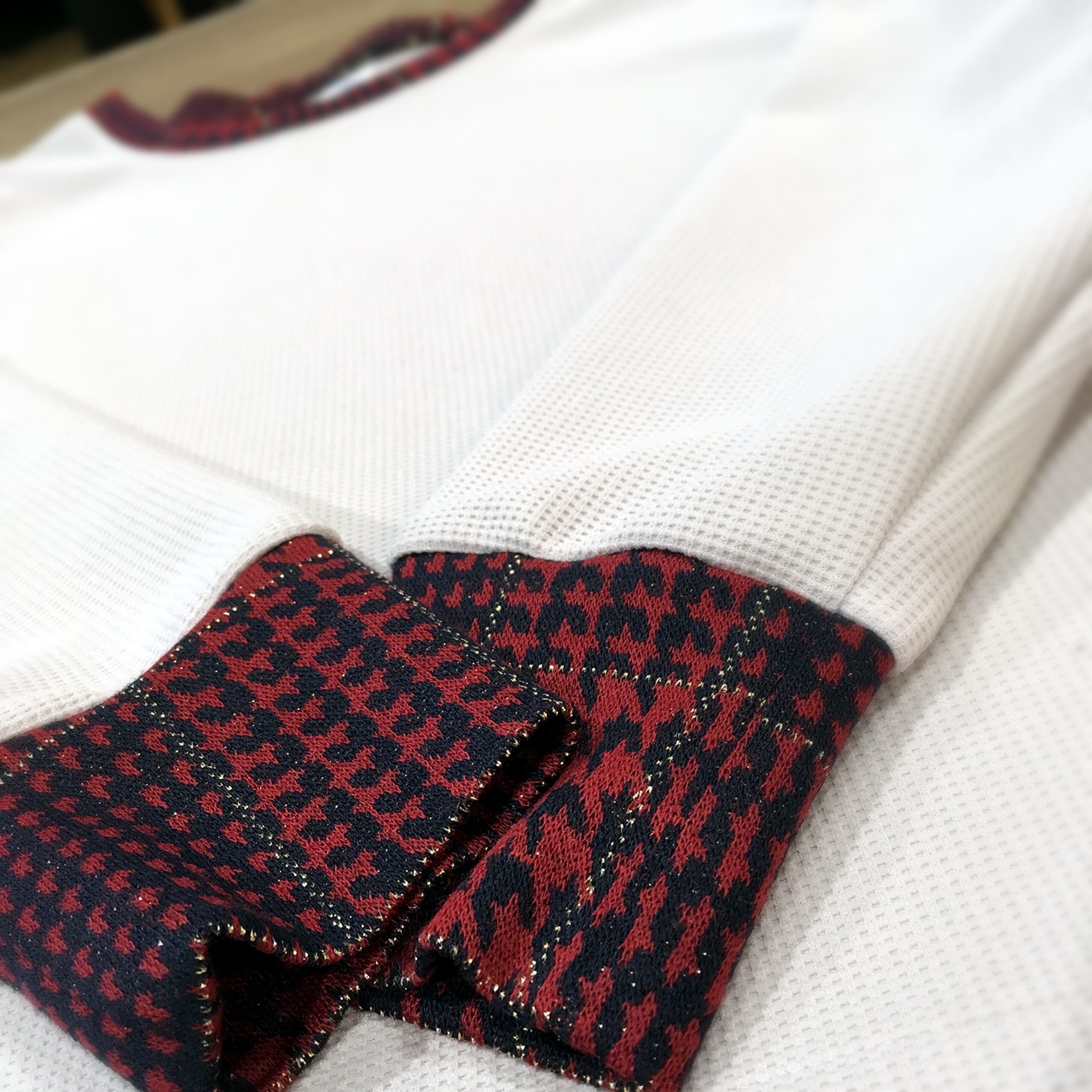 リブ部分は千鳥格子にところどころ金の筋が入った生地で、見頃や袖は少しワッフル生地のように凹凸がありストレッチ素材になっております。